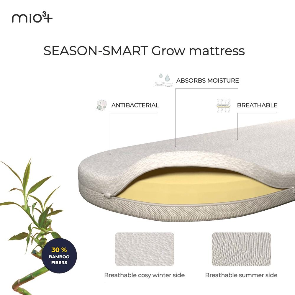 Двосторонній матрацик адаптується до будь–якої пори року: «дихаюча» літня сторона запобігає потінню, а затишна зимова сторона краще зберігає тепло. Жорстка основа підтримує правильне положення хребта дитини. Чохол із бамбукового волокна (30%) ефективно відводить вологу, є антибактеріальним та забезпечує природний комфорт.