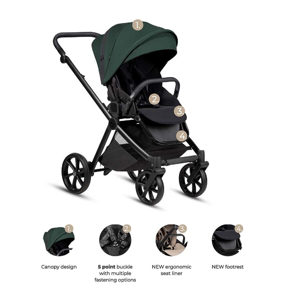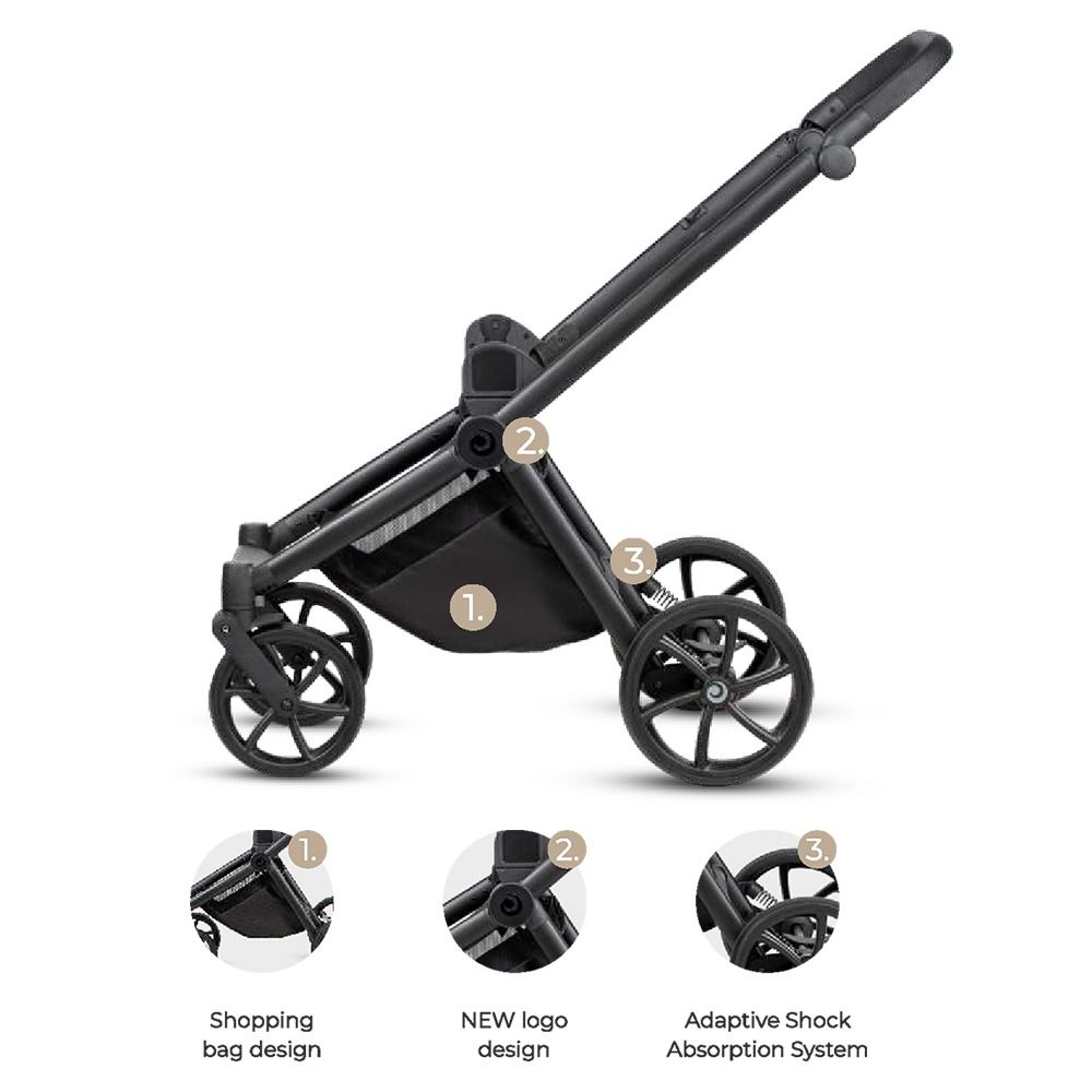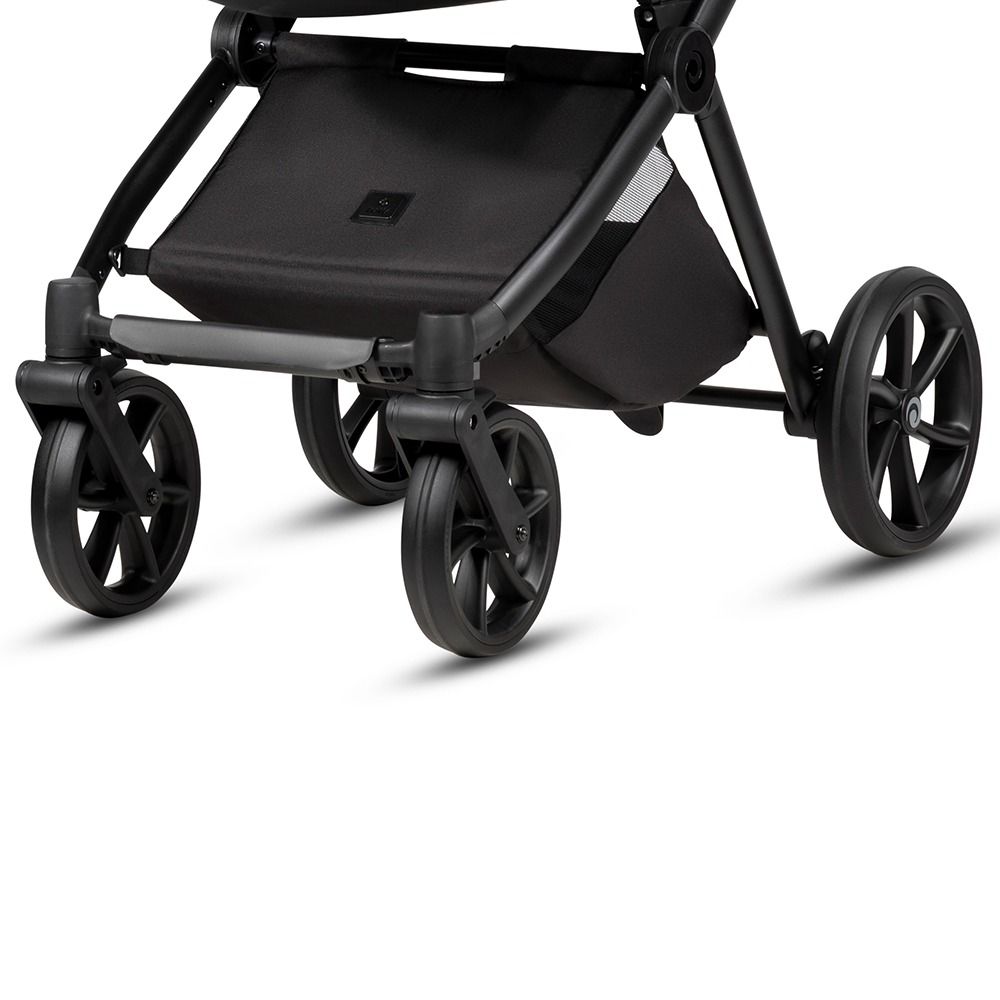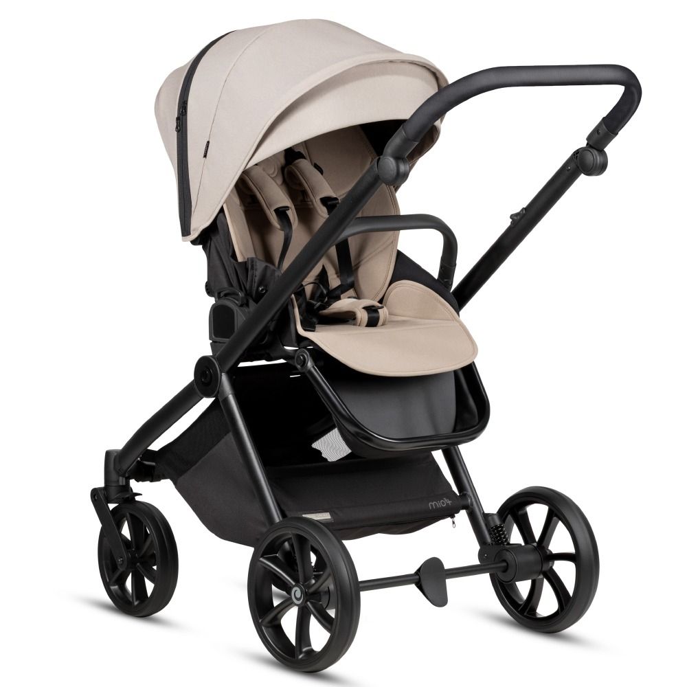 Коляска Mio 3+ має подвійну систему амортизації, яка включає підвіску передніх і задніх коліс, щоб забезпечити плавну, комфортну прогулянку та маневреність коляски. Гальмівна система One-Click™ забезпечує максимальну безпеку. Завдяки простому та миттєвому старту коляску можна зупинити лише одним клацанням ноги.