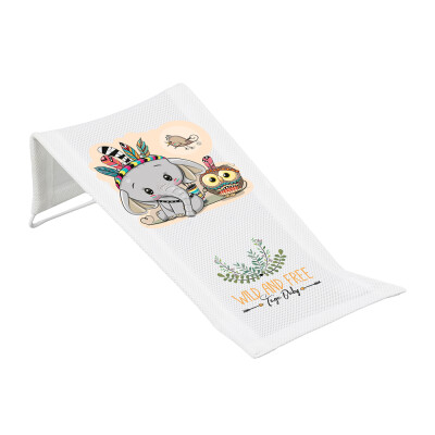 Дитяче сидіння для ванночки з малюнком підтримує голову дитини під час купання.