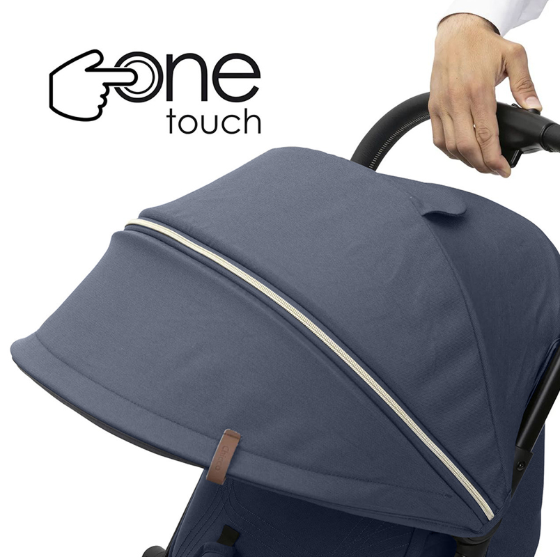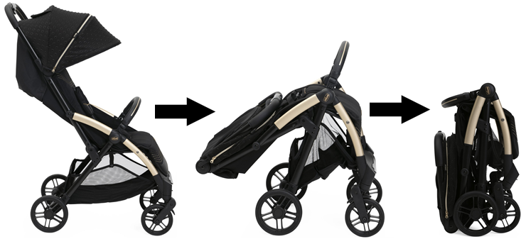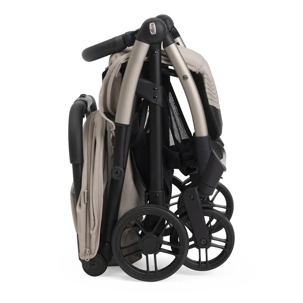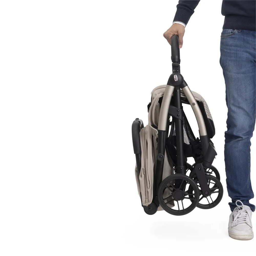 Коляска складається самостійно лише одним дотиком. У складеному вигляді вона стає надзвичайно компактною та стоїть вертикально без додаткової підтримки, що значно спрощує життя під час поїздок або зберігання у приміщенні.