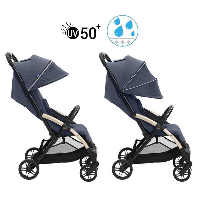 Розсувний капюшон забезпечує надійний захист завдяки фільтру UV50+ та якісному водовідштовхувальному покриттю. Для вентиляції та постійного зорового контакту передбачено зручне сітчасте віконце у верхній частині.