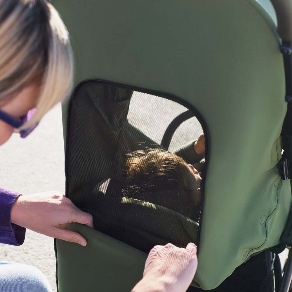 Віконце у верхній частині капюшона дозволяє спостерігати за малюком під час прогулянки.