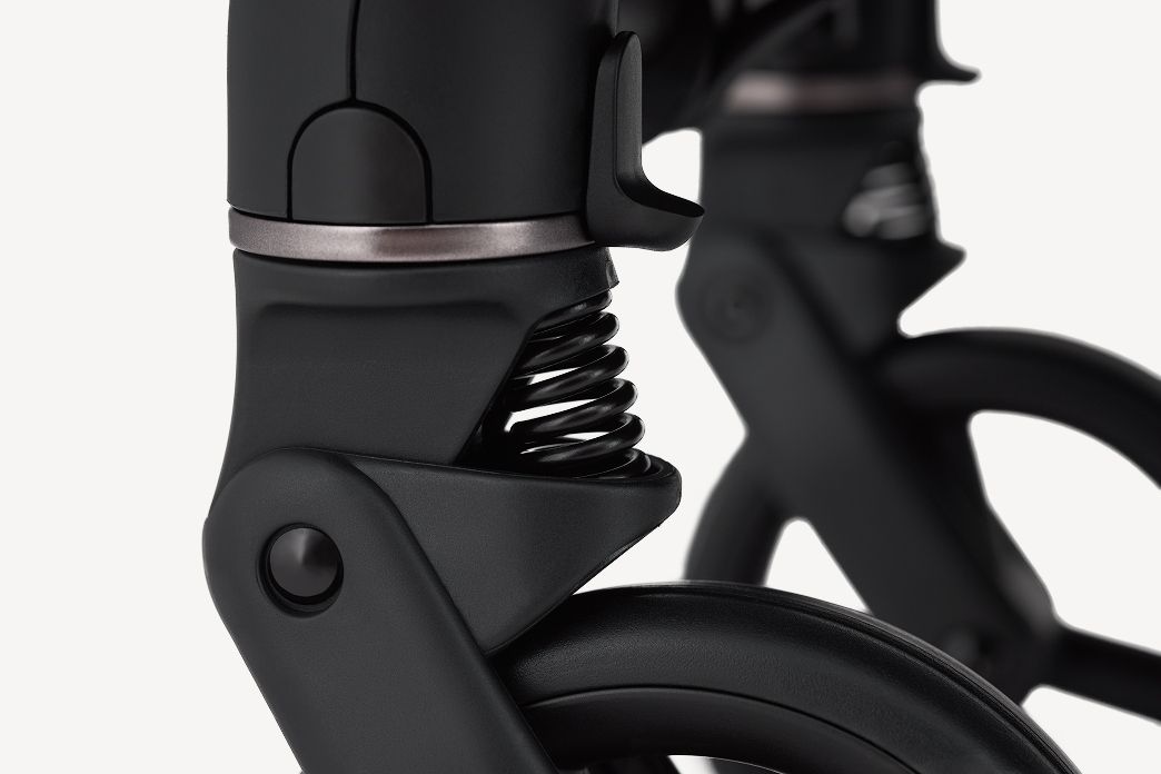 Унікальна система підпружинювання в механізмі складання рами (синхронно з амортизацією коліс) робить хід коляски неймовірно м'яким навіть на бруківці.