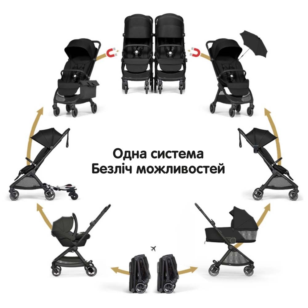 • Єдина у світі коляска з магнітною системою, яка автоматично приєднує аксесуари — або навіть іншу коляску — за одну секунду.
