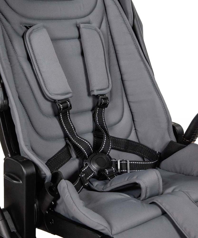 - Прогулянковий модуль обладнаний п’ятиточковою системою ременів безпеки, знімним, поворотним бампером та обмежувачем від зісковзування.