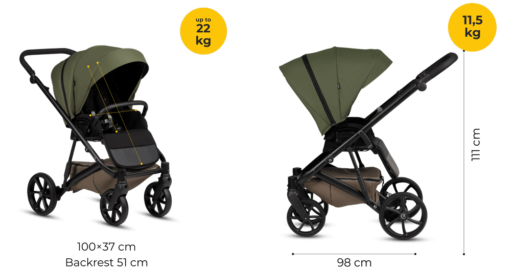 - Система адаптивної амортизації. Кожне колесо підтримує постійний контакт з землею, навіть на вибоїстій дорозі, що забезпечує більш стабільну їзду і мінімізує тряску для дитини.