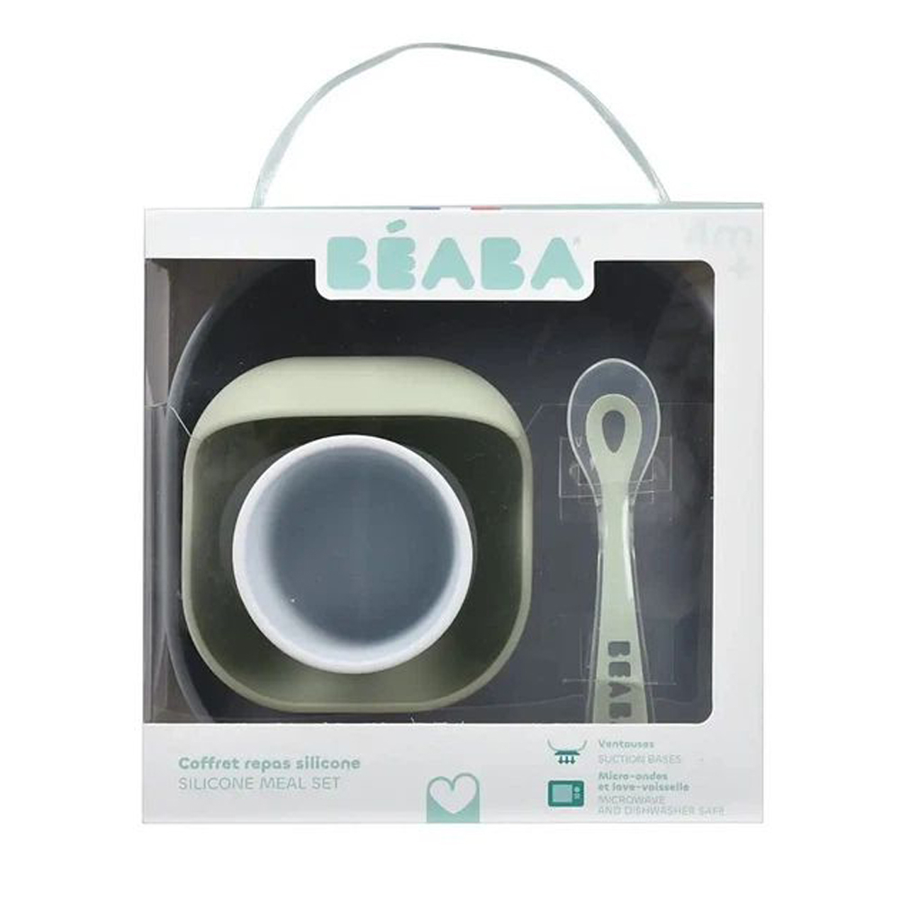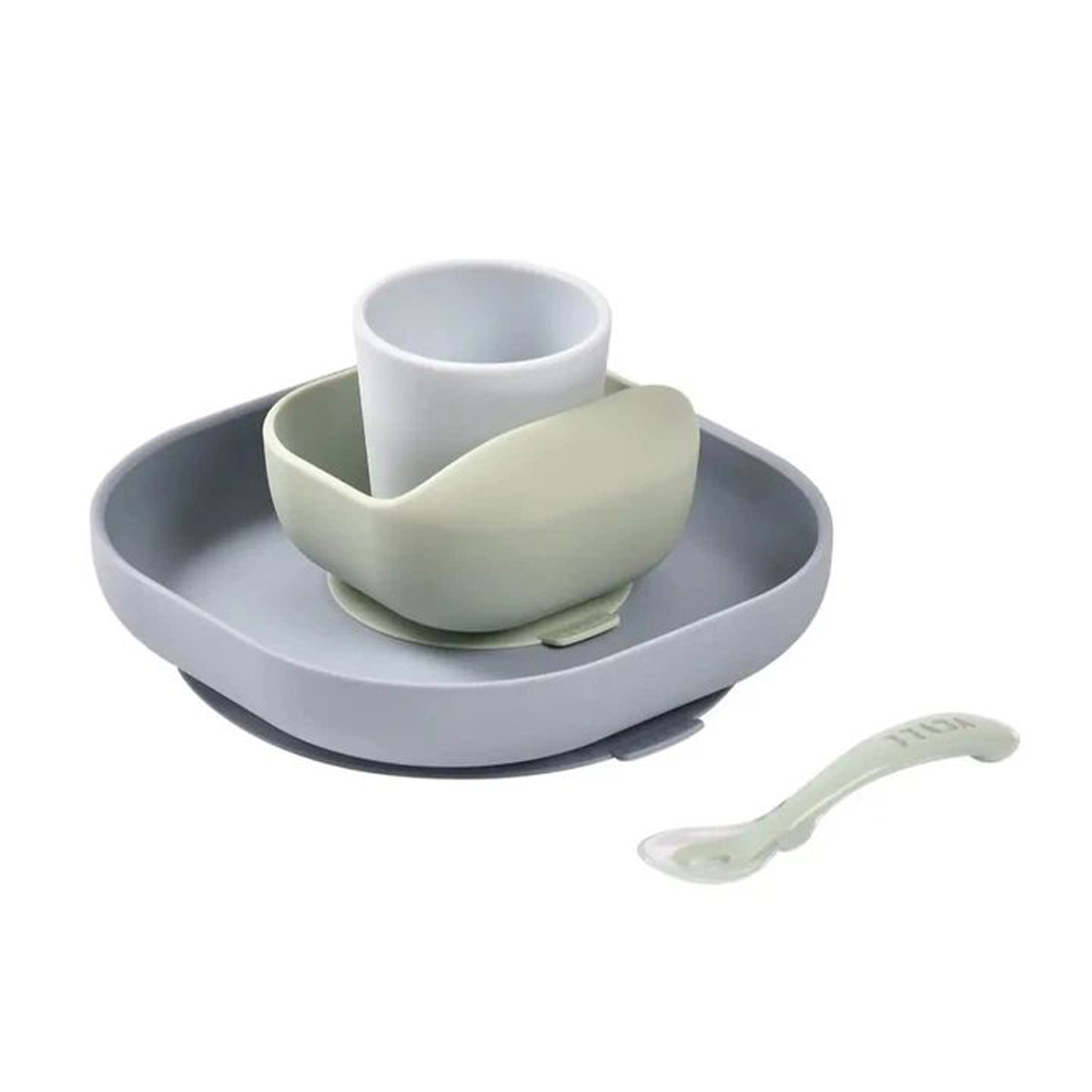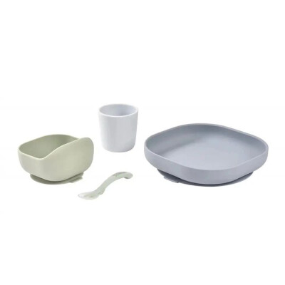 Набір: тарілка, миска, стакан, ложка Beaba 4+ (оливковий/сірий)