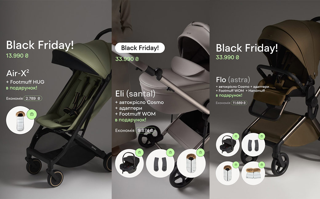 Лише в рамках Чорної П'ятниці — придбай одну з обраних моделей візочків Anex і отримай автокрісло або набір аксесуарів у подарунок.