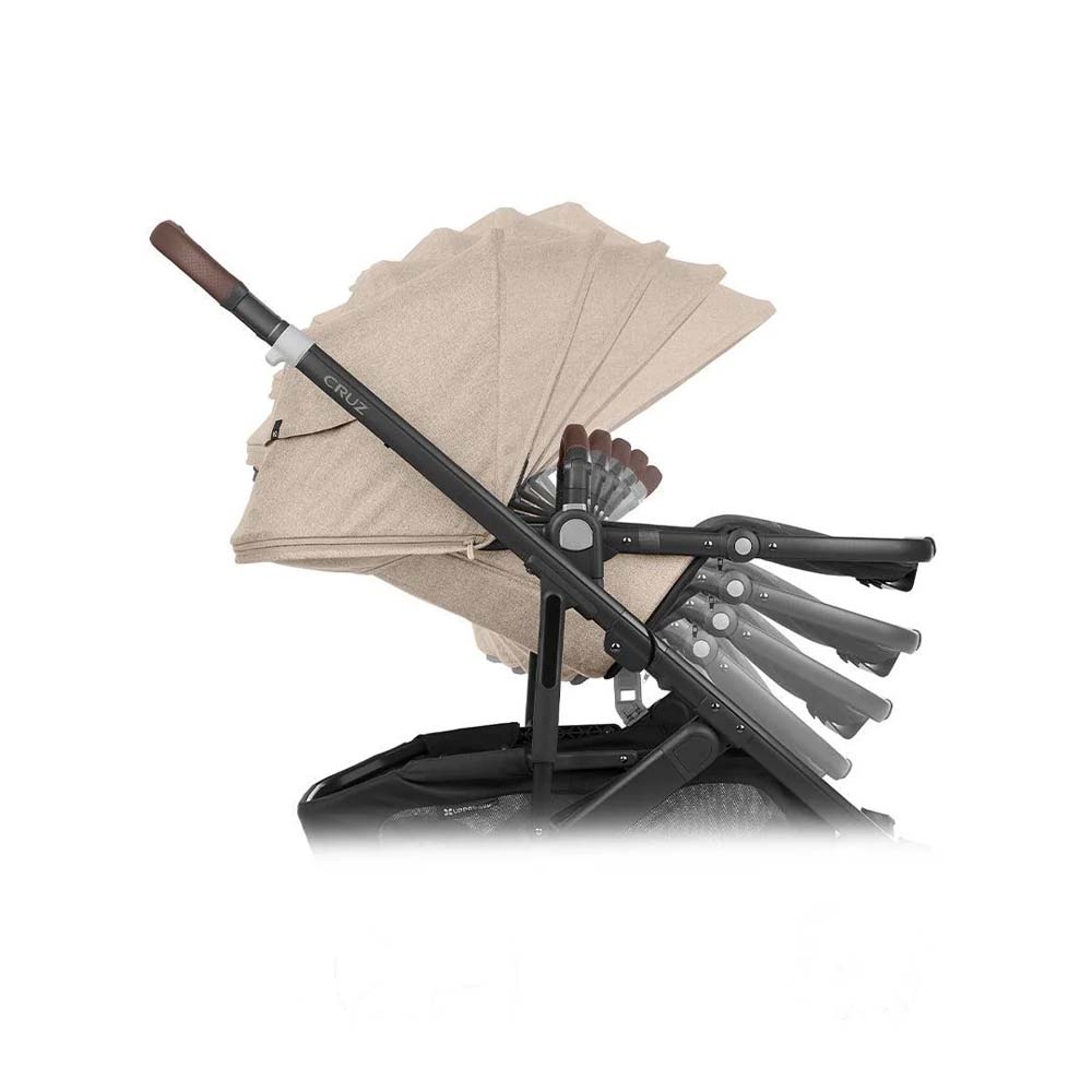 - Розкладний капюшон UPF 50+. Капюшон із захистом від сонця UPF 50+ має секцію, що розстібається, для додаткового затінення, а сітчасті вставки забезпечують вентиляцію й дозволяють легко поглянути на дитину. Регулювання висоти підходить для дітей, що ростуть.