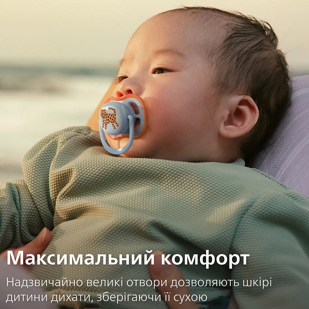 Пустушка Philips Avent серії Ultra Air створена спеціально для дітей з чутливою шкірою. Завдяки 4 збільшеним отворам у нагубнику, повітря вільно циркулює, що дозволяє шкірі дитини залишатися сухою та м’якою без подразнень.