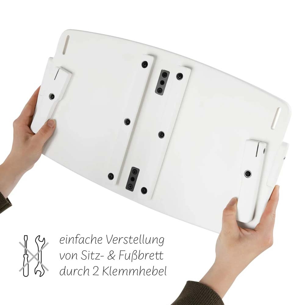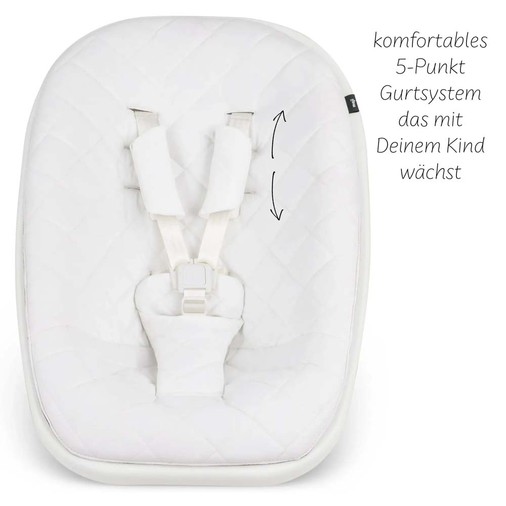 5-точкова система ременів безпеки, що входить до комплекту, яку легко прикріпити до стільця, забезпечує додаткову безпеку. Регульовані ремені ідеально підходять для будь-якого зростання дитини.