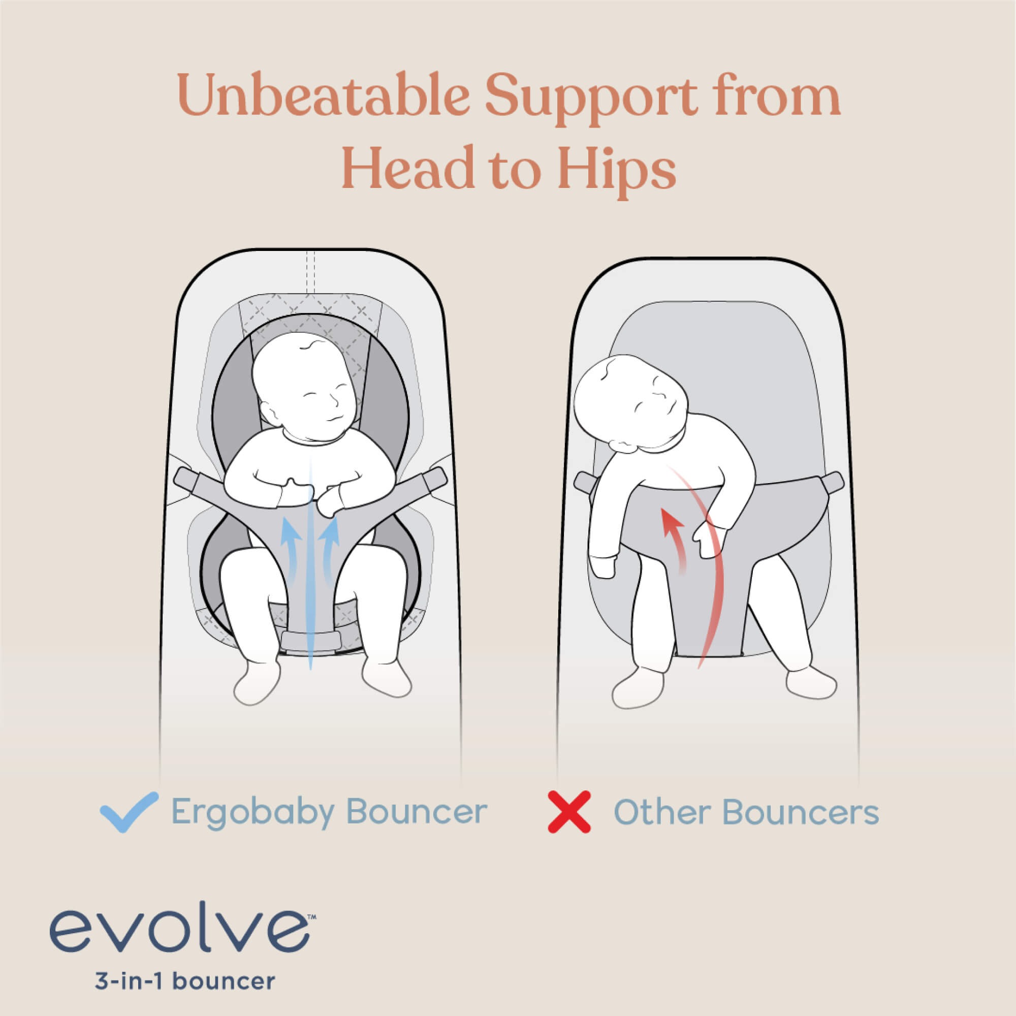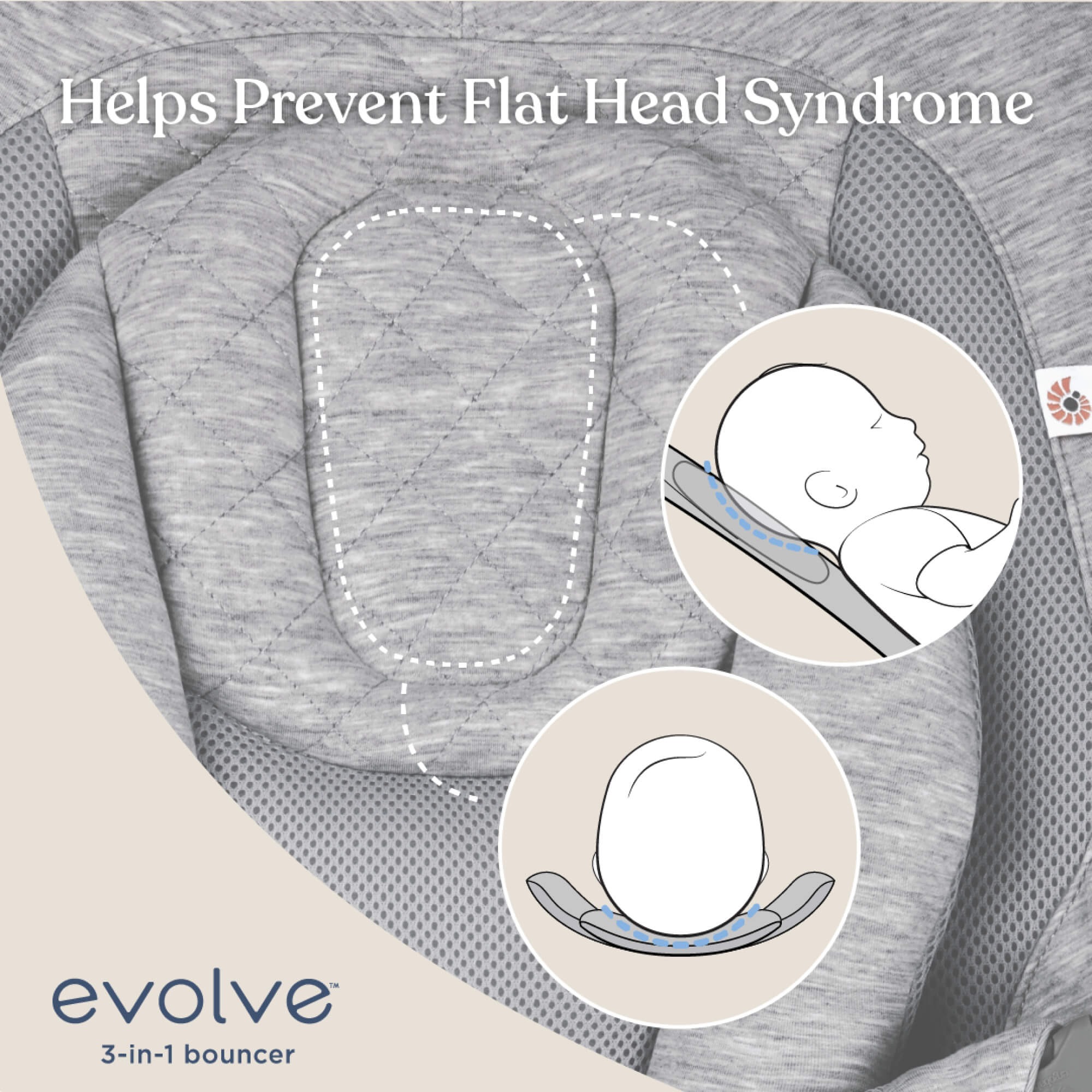 Спеціальна ергономічна вставка для новонароджених підтримує дитину від голови до стегон, запобігаючи синдрому плоскої голови.