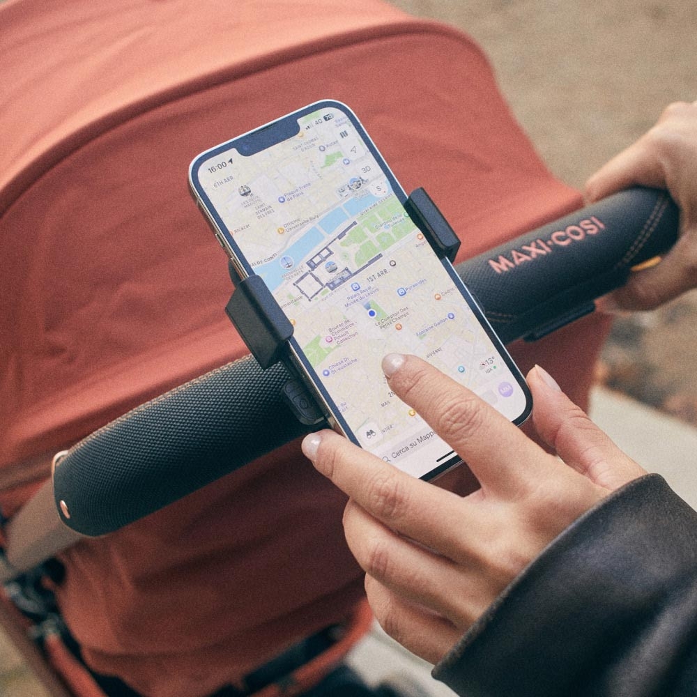 Тримач для телефона Maxi-Cosi надійно кріпиться до коляски, утримуючи будь-який смартфон і повертаючись на 180°. Удоскональте свій візок і тримайте телефон поруч із собою, щоб користуватися навігацією без рук, вибирати ідеальний плейлист або розважати малюка в дорозі.