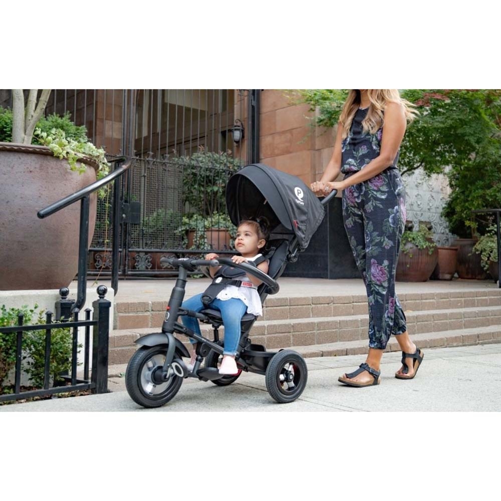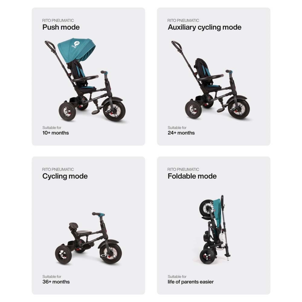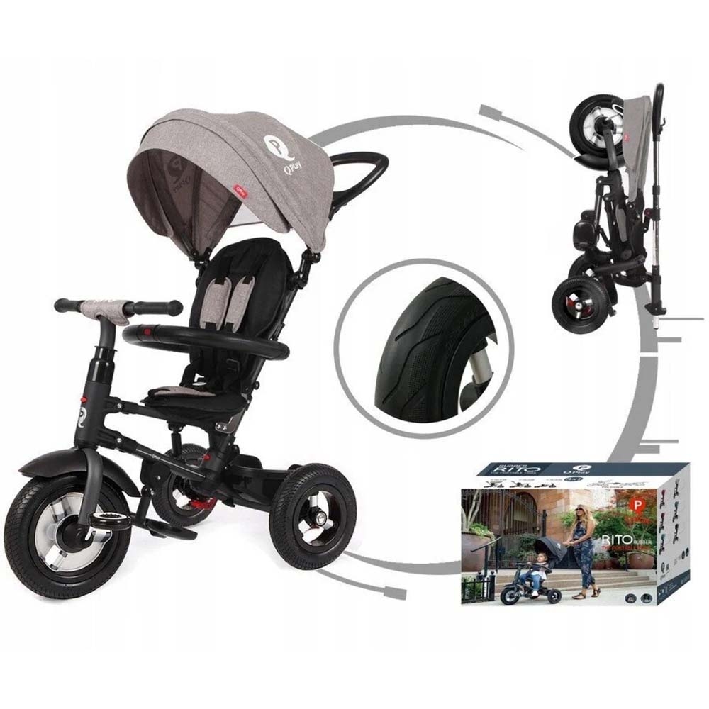 Триколісний велосипед QPlay Rito можна штовхати та контролювати дорослими до тих пір, поки дитина не навчиться їздити. У спекотний сонячний день капюшон захищає дитину, і при необхідності його можна легко демонтувати.
